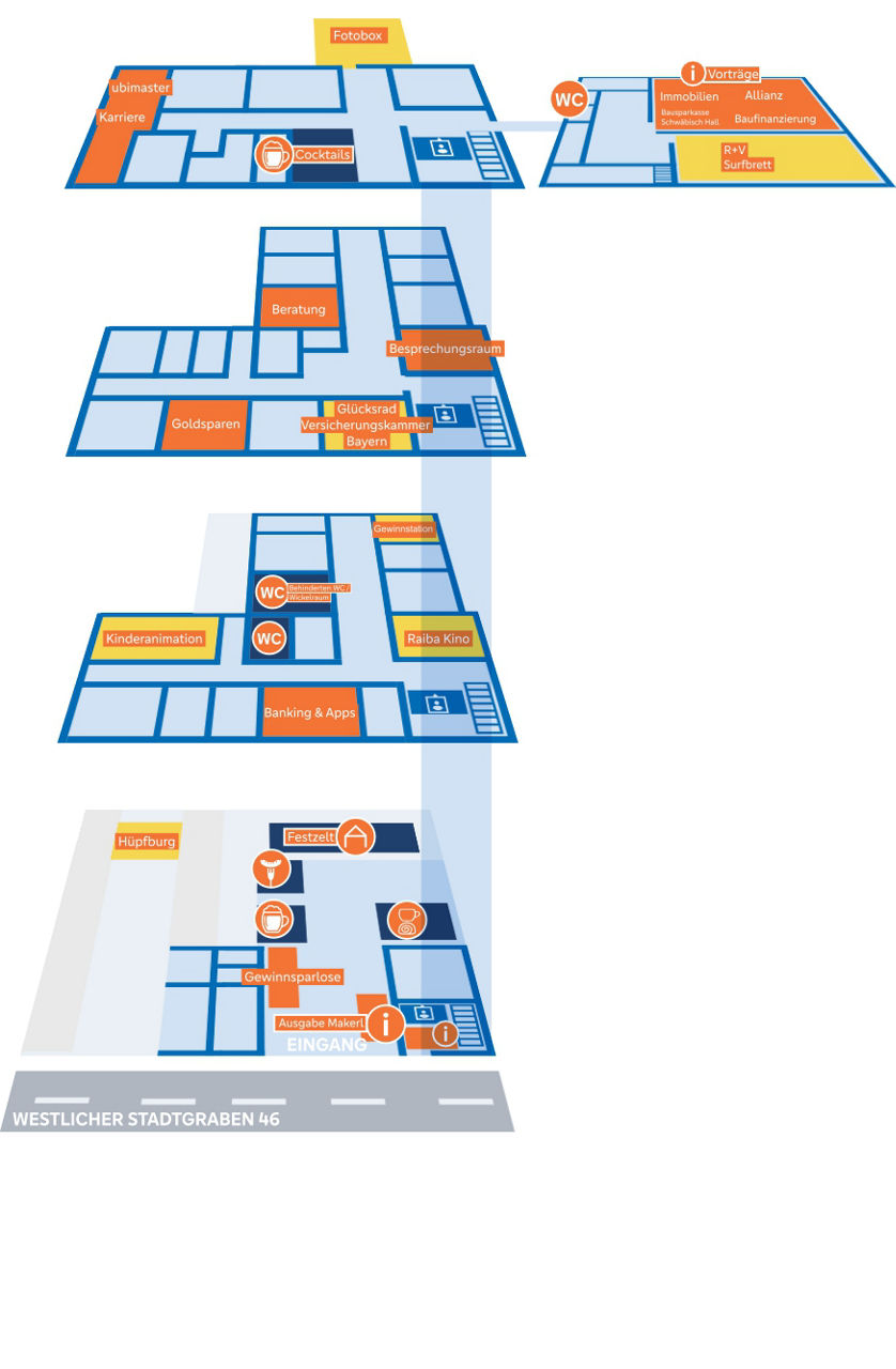 Themenraum: Banking & Apps, Raiba Kino, Kinderanimation, Gewinnstation (Tasse zum Bedrucken & mehr), Terrasse, WC, Behinderten WC & Wickelraum